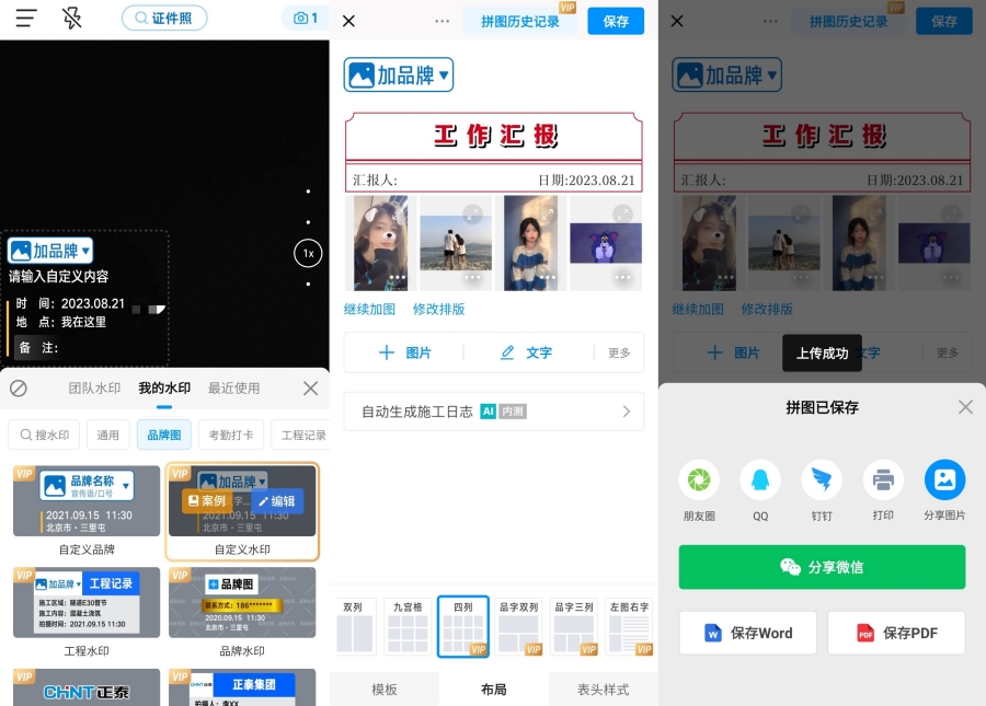 【版本说明】: 本次更新 修复已知问题,提升拍照速度。 近期更新 -【工作圈】支持自定义展示内容 -【客户管理】新增拜访记录个人版 版权声明: 其它第三方软件,擅自使用本公司及关联方享有著作权、商标权、专利权的相关内容,包括但不限于实施复制、抄袭、修改今日水印相机APP特有的水印模板、官方水印LOGO和电子出版物等内容,我们将依法追究行为人的刑事责任、民事责任和行政责任
