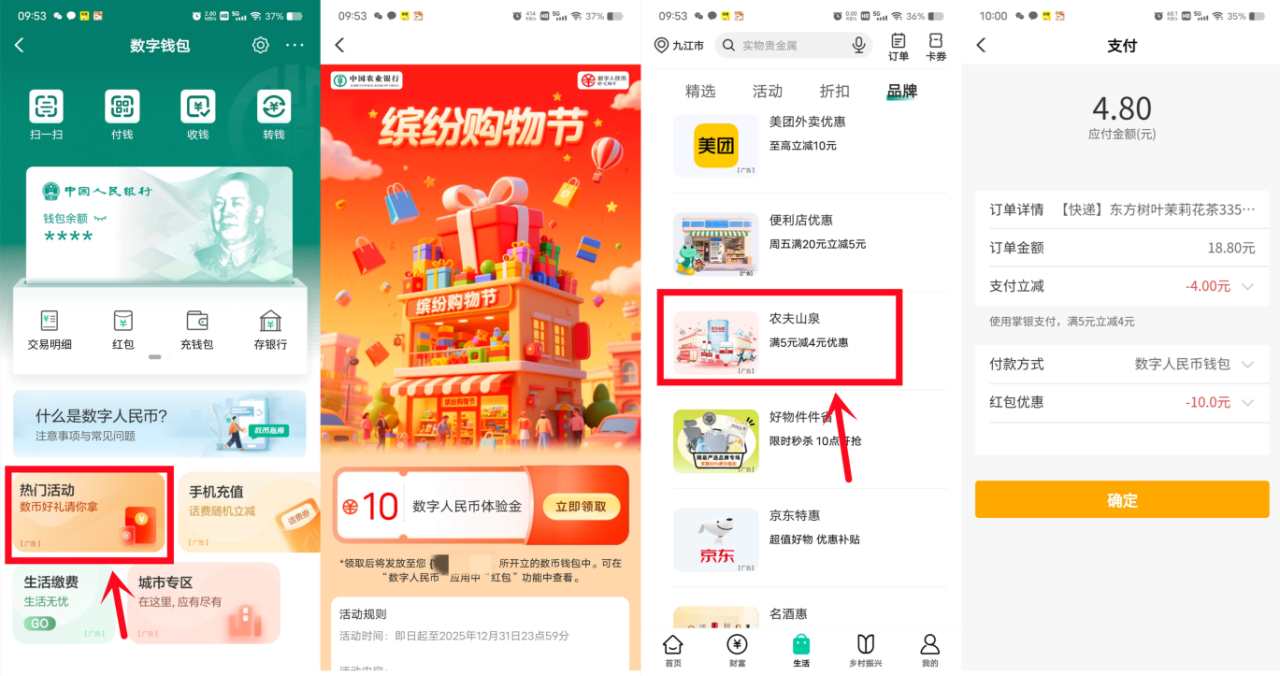 1、打开“中国农业银行”APP搜索【数字人民币】进去,点【热门活动】再点【数字人民币缤纷购物节】进去直接领10元数字人民币红包
